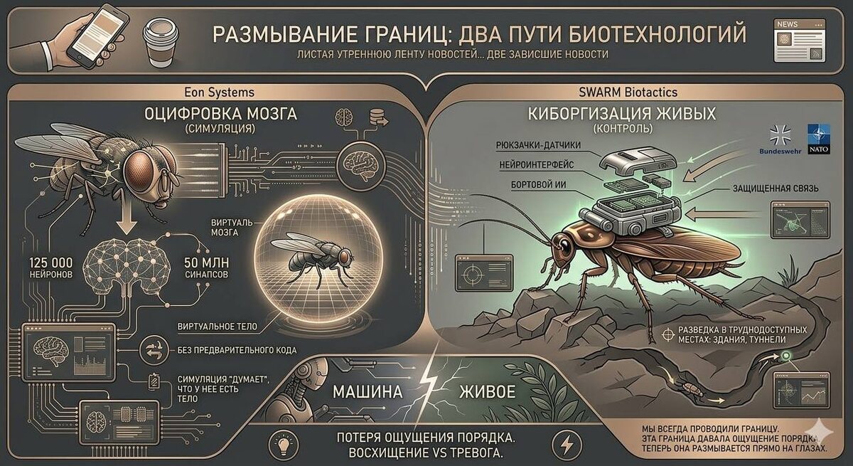 Наткнулась на две странные, но интересные новости в мире ИИ-стартапов 1️⃣ Стартап Eon Systems из Сан-Франциско оцифровал мозг мухи. Все 125 000 нейронов, 50 миллионов синапсов. Поместили модель в виртуальное тело и просто... запустили. Никакого кода с инструкциями. Мозг работает внутри симуляции и до сих пор "думает", что у него есть тело. Эксперты спорят, насколько это настоящий "аплоад", но сам факт уже не укладывается в голове. 2️⃣ Немецкий стартап SWARM Biotactics из Касселя пошел в другую сторону. Они не оцифровывают насекомых, они ими управляют. Живые тараканы с рюкзачками из датчиков, нейроинтерфейс, бортовой ИИ, защищенная связь. Уже протестировано и развернуто у платных заказчиков из НАТО, включая Бундесвер. Разведка в зданиях, туннелях, завалах. Там, куда дрон не пролетит. ✨ Две компании, два подхода. Одни копируют биологический мозг, другие превращают живое существо в управляемое устройство. Я честно не знаю, что чувствовать: восхищение есть, тревога тоже. Мы всегда про