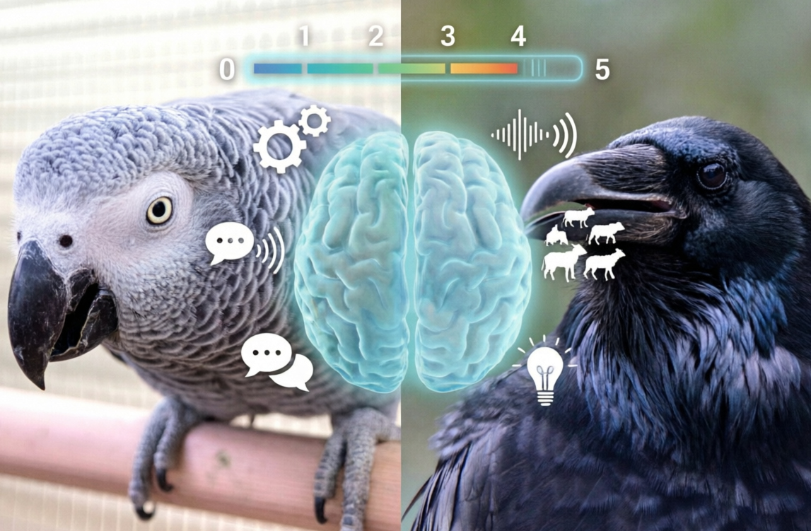 Попугай — 5 баллов. Попугаи, особенно такие виды, как ара и жако, демонстрируют уникальные показатели энцефализации. По соотношению числа нейронов к массе мозга они удерживают абсолютный рекорд среди птиц: у некоторых видов этот показатель достигает ~131 млн/г (для сравнения, у врановых он составляет около ~55–66, а у человека ~63,7). Их мозг, как и у воронов, организован в сложные нейроглиальные комплексы, обеспечивающие высокую скорость обработки информации, с особым акцентом на зрительную и слуховую обработку.