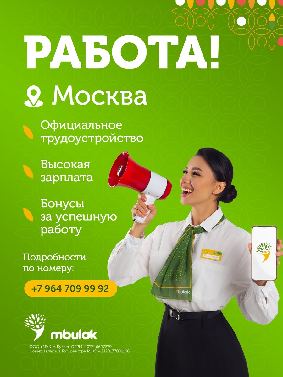! Не упустите шанс стать частью Компании М Булак! 📍Прямо сейчас мы ищем специалистов по выдаче займов в городе Москва! ✅ Стабильный доход: фиксированная зарплата + высокие бонусы ✅ Доплаты на проезд и моб. связь ✅ Обучим с нуля, опыт не требуется! ✅ Гибкий график ✅ Официальное трудоустройство ✅ Поощрение лучших: слёты за границей! Все подробности Вы можете узнать по номерам: 📞 +7 964 709 99 92 🚀 Не забудьте поделиться с друзьями, которые ищут работу в России!