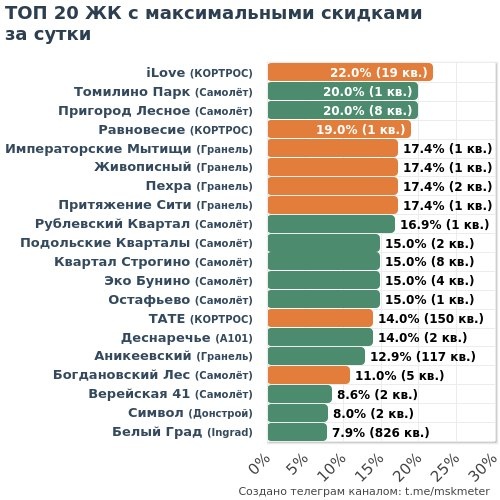 🟩 Честные скидки: 36 ЖК (1166 кв.) 🟧 Маркетинг скидки: 27 ЖК (567 кв.) 💎 МАКСИМАЛЬНАЯ ЭКОНОМИЯ 🏆 Самолёт • Квартал Строгино ├🔻3.2M → 21.6M • 2-к 59м² ├🔻2.8M → 18.5M • 2-к 59м² └🔻2.7M → 18.1M • 2-к 59м² 🥈 Гранель • Павелецкая от Гранель └🔻2.8M → 50.5M • 3-к 90м² 🥉 A101 • Деснаречье ├🔻2.7M → 19.6M • 3-к 75м² └🔻2.7M → 19.0M • 3-к 69м² 4️⃣ Самолёт • Верейская 41 └🔻2.7M → 31.6M • 2-к 61м² 5️⃣ ФСК • Сидней Сити └🔻2.4M → 33.8M • 2-к 62м² 6️⃣ Самолёт • Эко Бунино └🔻2.3M → 15.0M • 2-к 67м² 🔑 САМЫЕ ДОСТУПНЫЕ 🏆 Самолёт • Космический Квартал ├🔻148к → 4.9M • Студия 23м² ├🔻152к → 5.1M • Студия 23м² └🔻155к → 5.2M • Студия 23м² 🥈 Гранель • Аникеевский ├🔻703к → 5.5M • Студия 28м² ├🔻711к → 5.5M • Студия 27м²❗️ └🔻712к → 5.5M • Студия 28м² 🥉 Ingrad • Белый Град ├🔻338к → 5.6M • Студия 21м² ├🔻329к → 5.6M • Студия 21м² └🔻347к → 5.6M • Студия 21м² ❗️— лоту меньше месяца 👇 Полная статистика: 📲 В Telegram | 🌐 На MskMeter.ru