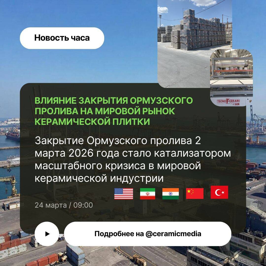 Краткий обзор ситуации Закрытие Ормузского пролива 2 марта 2026 года стало катализатором масштабного кризиса в мировой керамической индустрии. Иран, занимающий пятое место в мире по производству плитки (около 450 млн кв. м в год), оказался отрезан от экспортных рынков. Это вызвало цепную реакцию, затронувшую не только Иран, но и ключевых игроков, таких как Индия, а также изменило структуру глобальных поставок. Основные последствия Последствие | Описание Паралич иранского экспорта Более 150 судов с керамикой заблокированы в Персидском заливе, экспорт на сумму $500 млн остановлен. Кризис в Индии (Морби) 65–70% предприятий зависят от пропана из Персидского залива; запасов хватит на 3 дня, возможен массовый простой. Рост логистических издержек Экстренные тарифы на перевозку выросли на 250–300%, что критично для низкомаржинальной керамической продукции. Энергетический дефицит В Иране сокращены поставки газа для промышленности, что замедляет восстановление производства даже после открытия