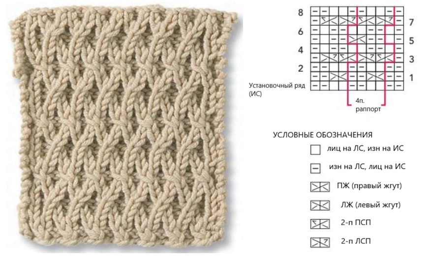 ПЛЕТЕНЫЙ ЖГУТ (кратно 4 п. + 6) ПЖ (правый жгут) Провязать 2лвм и оставить петли на левой спице, ввести правую спицу между 2 петлями и провязать первую петлю еще раз, снять обе петли со спицы вместе. ЛЖ (левый жгут) Правой спицей позади левой спицы пропустить первую петлю и провязать 2-ю петлю лицевой скрещенной, затем провязать первую петлю и снять обе петли со спицы вместе. 2-п ПСП Снять 1 п. на вспом. спицу и держать за работой, 1 лиц, 1 изн со вспом. спицы. 2-п ЛСП Снять 1 п. на вспом. спицу и держать перед работой, 1 изн, 1 лиц со вспом. спицы. Установочный ряд (ИС) *2 лиц, 2 изн; повторять от * до последних 2 п., 2 лиц. Ряд 1 (ЛС) 2 изн, *ЛЖ, 2 изн; повторять от * до конца. Ряд 2 *2 лиц, 2 изн; повторять от * до последних 2 п., 2 лиц. Ряд 3 1 изн, *2-п ПСП, 2-п ЛСП; повторять от * до последней п., 1 изн. Ряд 4 1 лиц, *1 изн, 2 лиц, 1 изн; повторять от * до последней п., 1 лиц. Ряд 5 1 изн, 1 лиц, *2 изн, ПЖ; повторять от * до последних 4 п., 2 изн, 1 лиц, 1 изн. Ряд 6