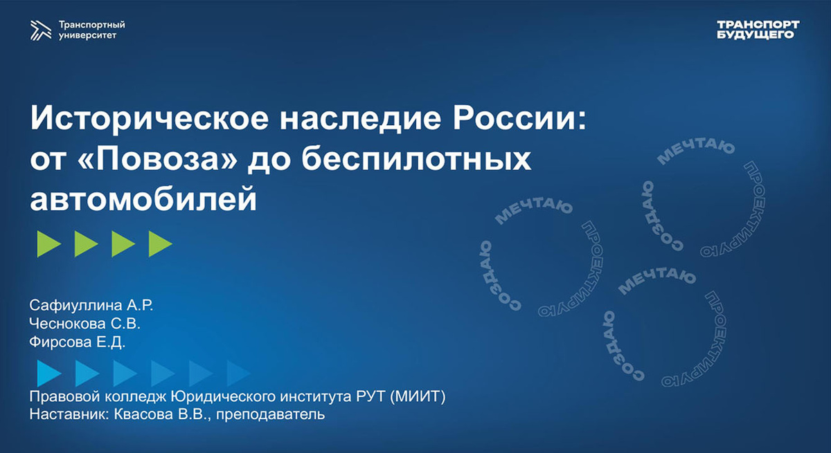 образовательной подготовки и исследовательских навыков учащихся. В номинации «Городские и региональные транспортные системы» представлена работа «Развитие монорельса в России». Её авторы — команда студентов группы ЮСА‑251: Бакулина Алёна и Правдина Ксения. Научный руководитель проекта — Е. А. Лотоцкая. Исследование предлагает перспективные решения для внедрения монорельсовых систем в российских городах. В номинации «Историческое наследие на транспорте» работа «Историческое наследие Ро