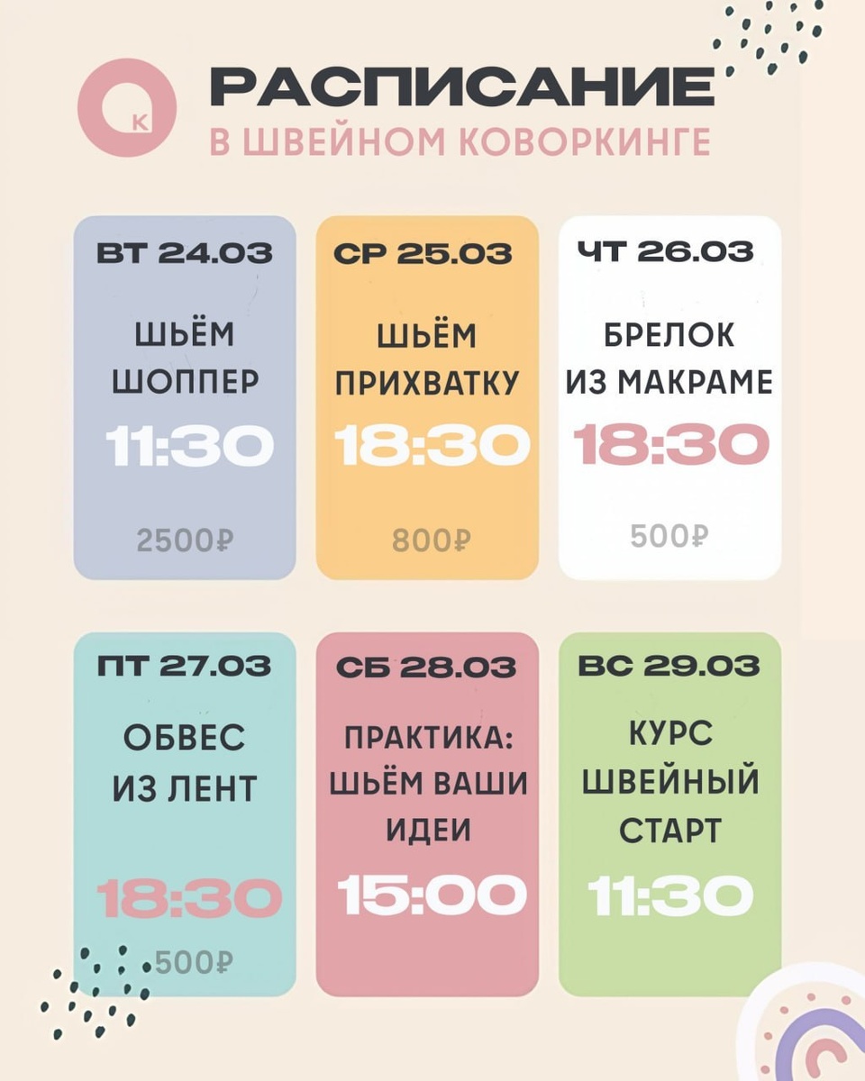 ? 🪡 Дело в том, что в Белгороде заработал швейный коворкинг 🌸 #идёмбесплатно на этой неделе в Креатив-Таун ➡️ Вход по регистрации ✍️Краткое расписание: 24 марта | Шьём брендовый шоппер | запись 25 марта | Шьём прихватку | запись 26 марта | Плетём брелок в технике макраме | запись 27 марта | Шьём обвес из лент | запись 28 марта | Практическое шитье: делаем вещи по вашему запросу | запись 29 марта | Курс «Швейный старт» | запись 💬«Выбирайте удобную дату и записывайтесь! Мы уже ждём вас в швейном коворкинге», — отметили организаторы. Ставьте — ❤️, если вам интересна эта афиша Не забудьте подписаться на наш канал в MAX❤️