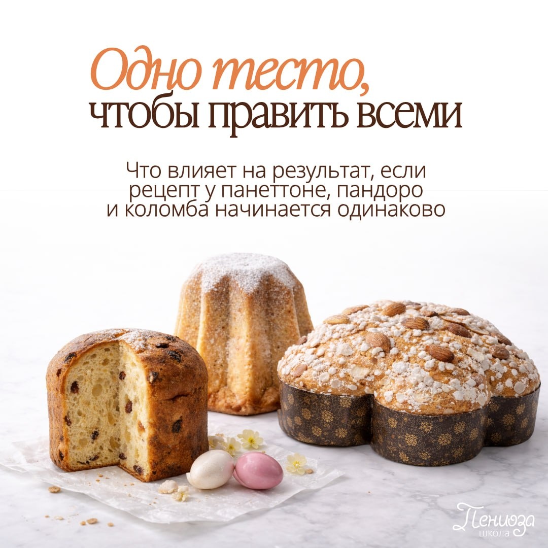 Если вы читали прошлый пост, то заметили: у панеттоне, пандоро и коломбы есть отличия. Но техпроцесс начинается одинаково. 🤔 И вот тут закопана главная сложность. Все три изделия — это высокорецептурная сдоба: 🧈много масла, сахара, желтков. Их нужно ввести в белковую сетку так, чтобы она не развалилась. ⚔️ Жир и сахар — прямые враги клейковины: — Жир обволакивает белковые нити и мешает им связываться. — Сахар тянет на себя воду. Если ввести всё сразу, получится просто кекс. ❌ Рассыпчатый, без тяжа и без той самой пористости, описанной в декрете. Поэтому тесто ведут в несколько стадий. Сначала развивают клейковину, потом постепенно нагружают её жиром и сахаром, порция за порцией. 1️⃣ Панеттоне и коломба → минимум 16% жира. 2️⃣ Пандоро → все 20%. То есть, пандоро — самый жирный и сложный вариант. Клейковина должна удержать на 25% больше жира, сохранив шелковистый, мелкопористый мякиш. ✅ Логика простая: освоите пандоро ➡️ панеттоне и коломба станут проще. В них меньше жира, а ц