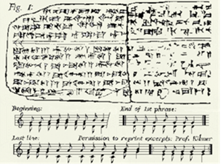 Кто придумал ноты? История музыки, как пишут музыковеды, уникальна и стара, как мир. Самый древний, уцелевший фрагмент нотной записи, был найден на шумерской глиняной табличке. Утверждается, что ей четыре тысячи лет. На одной из найденных 36 табличек полностью сохранилась мелодия гимна, посвященная жене Шумерского царя Никкаль, богине садов и фруктов. Гимн №6 в её честь пели в конце лета, когда все плоды были собраны. Ноты гимна в честь богини Никкаль Богиня Никкаль и её супруг, бог Луны Нанна Из вышеизложенного можно сделать два очевидных вывода: 1. Не только у древних греков были боги и Муза священных гимнов. 2. Была ещё одна древняя цивилизация – Шумерская. Возможно, с Луны и прибыла, раз муженёк богини-«агрономши» Никкаль называл себя богом Луны. И ещё один факт показался мне интересным, когда я блуждала в лабиринтах древнегреческой мифологии: поэтов, певцов и музыкантов Древней Эллады ценили очень высоко и ставили всего лишь на одну ступеньку ниже богов. В общем, история эта древн