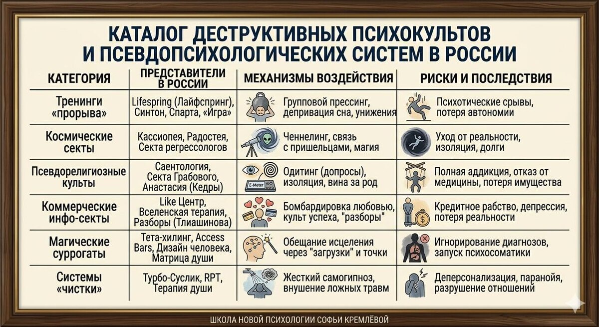 ? В лентах соцсетей — парад «просветленных». Под вывеской помощи сегодня скрывается всё: от доказательной науки до коммерческих сект, обещающих исцеление судьбы за один «разбор». Как клинический психолог, я регулярно работаю с последствиями таких экспериментов над психикой. Давайте проведем черту: где заканчивается профессиональная помощь и начинается опасная манипуляция. Что точно НЕ является психотерапией: ❌ Магическое мышление. Если фундамент метода — карма, родовые проклятия, «вселенские каналы» или вибрации. Тета-хилинг, дизайн человека, регрессии в прошлые жизни — это эзотерика, а не психология. ❌ Чудо за один сеанс. Обещание «перезаписать» тяжелую травму за 2 часа — главный индикатор шарлатанства. Психика — инертная система, она требует бережности и времени. ❌ Гуру вместо терапевта. Если «специалист» говорит от имени Высших сил, требует безусловной веры в метод или запрещает критику — перед вами манипулятор. Каталог деструктивных систем (сохраните, чтобы не потерять): 📍 Т