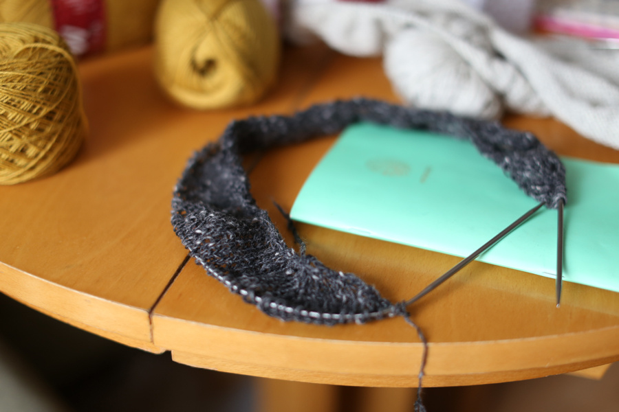 Те друзья-свитера, что вяжутся лицевой гладью в полудрёме, конечно, быстрее пойдут, но главное ведь не скорость, главное: "зачем?":)). Ответы, к счастью, имеются: светло-серый - из-за большого ворота; горчичный - из-за носочной пряжи; зелёный - не обсуждается, госпрограмма:))) и тёмно-серый, правильно, кто узнал, это Донегал Твид Софт. На донегале надо опробовать тот самый воротник с переходом от 116 петель к 88 (чтобы как на чёрной водолазке), и уменьшенную длину на -50 рядов (столько было определено при примерке у зеркала относительно бордового свитера)