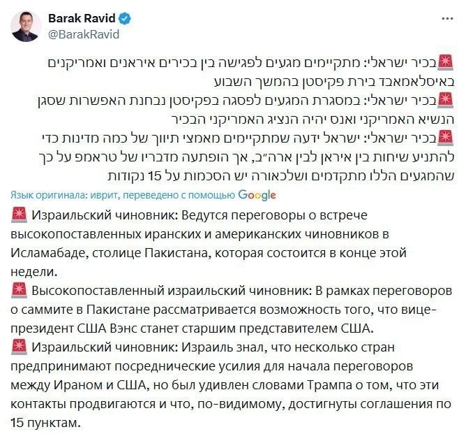 Организация встречи между Вашингтоном и Тегераном на высшем уровне обсуждается в столице Пакистана, сообщает Axios со ссылкой на высокопоставленного израильского чиновника. По его данным, американскую делегацию может возглавить вице-президент Джей Ди Вэнс. Журналист Барак Равид отметил, что Израиль знал о посредничестве ряда стран, но был удивлен заявлением Дональда Трампа о том, что договоренности, вероятно, уже достигнуты по 15 пунктам. В МИД Ирана опровергают информацию о проведении переговоров с США.