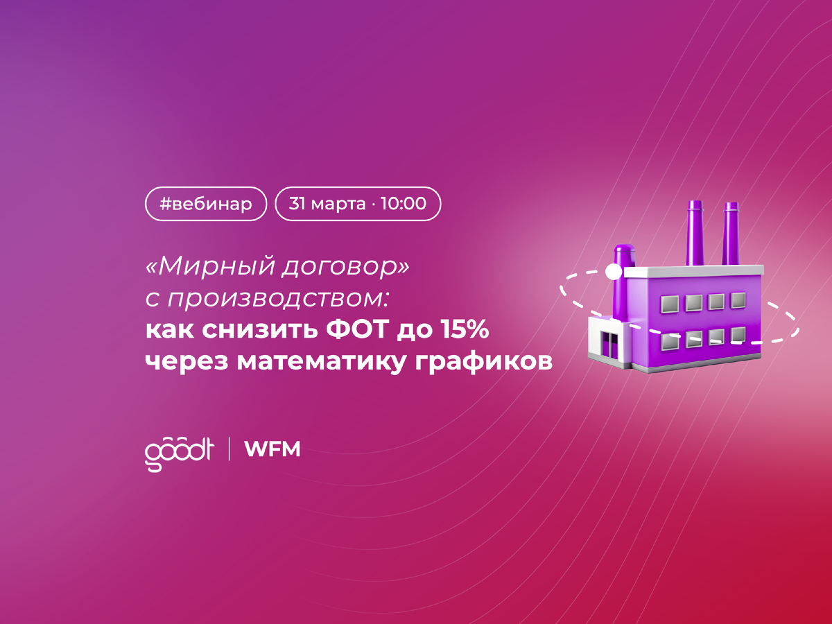 Приглашаем вас на бесплатный вебинар от ведущего эксперта Goodt WFM - о том, как находить скрытые резервы фонда оплаты труда без сокращения персонала. Как с помощью WFM-подхода и анализа графиков выявить потери бюджета, которые обычно остаются незаметными. 31 марта в 10:00 (МСК) вебинар для HR-директоров и руководителей производственных компаний: «Мирный договор» с производством: как снизить ФОТ до 15% через математику графиков. Обсудим: - Где в производстве «утекает» ФОТ, даже если все работают. - Почему стандартные графики 2/2 и 5/2 часто создают перерасход. - Как перестать спорить с производством и начать говорить на языке цифр. - Как находить до 15% скрытых резервов ФОТ. Спикер: Алексей Колганов, директор по продукту Goodt WFM Ваш эксклюзивный бонус: все участники вебинара получат калькулятор диагностики потерь ФОТ и чек-лист экспресс-аудита графиков. Регистрируйтесь на вебинар 31 марта по ссылке и готовьте вопросы - встретимся в 10:00 (МСК)!