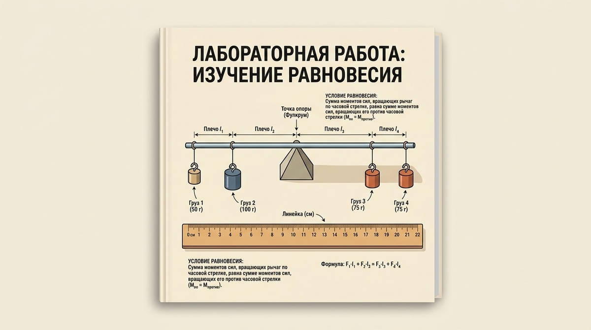 Меня до сих пор немного смешит этот момент в 7 классе: стоишь у штатива, вешаешь грузики, всё вроде сходится — и тут рычаг чуть клонится влево. Ты двигаешь груз на сантиметр. Потом обратно. Потом опять. Преподаватель смотрит с видом «ну-ну». Знакомо? Лабораторная работа по изучению равновесия — одна из первых «настоящих» физических работ в школе. И одна из тех, где большинство делает одни и те же ошибки по кругу. Цель этой работы — проверить на опыте правило моментов. Грубо говоря: рычаг в равновесии, если произведение силы на её плечо слева равно такому же произведению справа. Формула: F₁ × l₁ = F₂ × l₂ Звучит просто. Но когда руками — другое дело. Горизонтальное положение рычага перед работой никто не проверяет. Вешают грузики — и начинают измерять. А рычаг при этом уже немного наклонён, потому что его не уравновесили заранее с помощью регулировочных гаек на концах. Я сам так облажался. Получил результаты, не совпавшие с теорией, и не понял почему. Оказалось — начальный наклон «съе