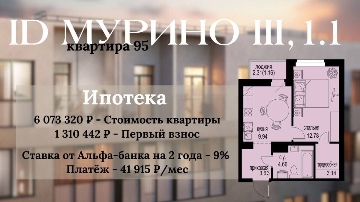 %❤️ Подготовили расчёт по однокомнатной квартире в проекте iD Murino III, к.1.1, №95 (35.31 м²) 💡Сделку в проекте возможно провести по ДДУ. Подача ДДУ на регистрацию строго до конца марта 🤟 Дом полностью готов, уже в июне начнем выдачу ключей Условия ипотеки: ✔️Программа: Новостройка ✔️Банк: Альфа-банк ✔️Ставка - 9% на 2 года, далее 21,59% ✔️Min первый взнос от 20,1% Преимущества программы: ⭐️Возможно рефинансирование после снижения ключевой ставки ЦБ ⭐️Подходит для клиентов, кто хочет зафиксировать текущую стоимость квартиры, но пока ждёт, продажу своей недвижимости ⭐️ Минимальная нагрузка в первые 2 года ипотеки позволит завершить ремонт в новой квартире без больших трат ✅ Бесплатная консультация. 📲 89049606910