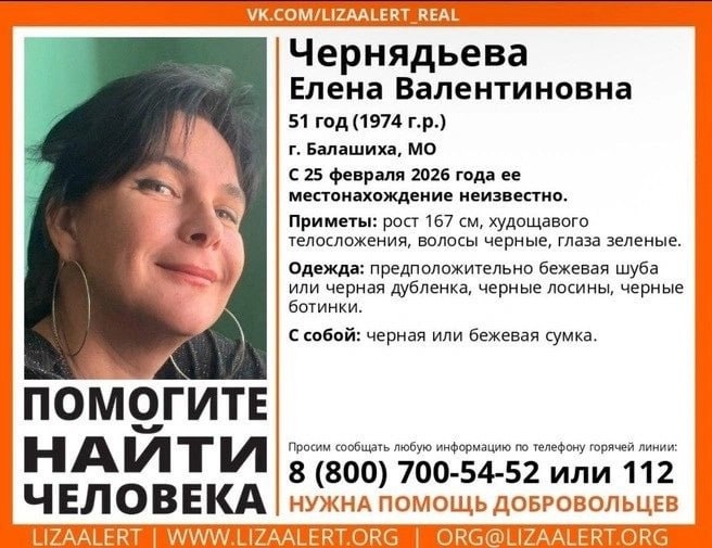 В конце февраля в городе Балашиха пропала 51‑летняя Елена Чернядьева. Последний раз её видели 25 февраля — тогда она покинула дом в бежевой шубе или чёрной дублёнке, чёрных лосинах и ботинках, с сумкой в руках. Последним, кто общался с женщиной, был её сожитель. Дочь пропавшей и её дядя подали заявления в полицию, но поиски пока не дали результатов. По словам дочери, Елена не работала и жила на сбережения, занималась домашними делами. Полиция опросила сожителя женщины, который заявил, что она просто ушла из дома. Информацию о местонахождении Елены ждут по телефонам: 8 (800) 700‑54‑52 или 112. 📱 Чехов Вид в MAX