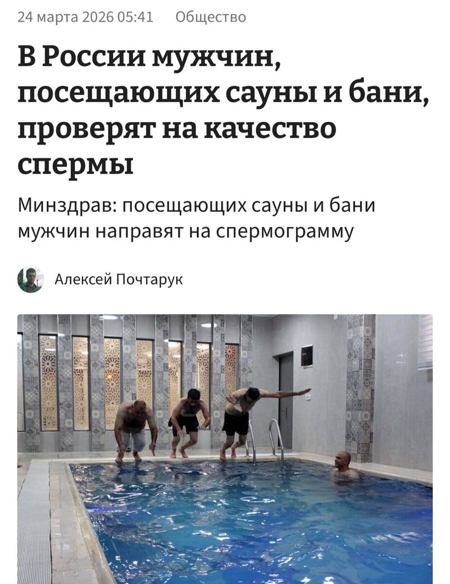 В рамках диспансеризации будут проводить оценка репродуктивного здоровья населения. Если мужчина укажет в анкете, что часто бывает в банях, саунах или других местах с высокой температурой, его направят на спермограмму. Вы знаете, кому отправить. CtrlAltDelights- подписаться