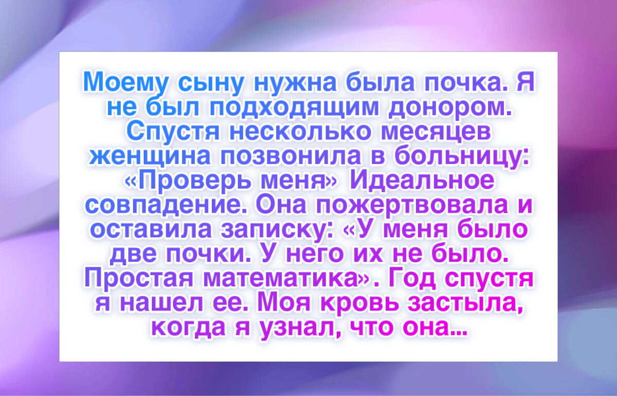 “Моему сыну нужна была почка. Я не подошел как донор, никто из семьи тоже. Мы написали в интернете, но месяцами никто не откликался. Потом одна женщина из другого конца страны позвонила в больницу и сказала, чтобы проверили ее. Она идеально подошла. Она прилетела, отдала почку и уехала, даже не оставив имени. Только записку: «У меня было две, у него не было ни одной. Математика простая». Через год я нашел ее и узнал, что она мать одиночка с тремя детьми и работает на двух работах. Она увидела наш пост и не смогла спать ночью. Она взяла отпуск за свой счет, прилетела и спасла моего сына. Она сказала, что когда ее сыну было шесть лет, ему тоже сделали пересадку, и его спас незнакомый человек. Она ждала двенадцать лет, чтобы вернуть этот долг миру.”
