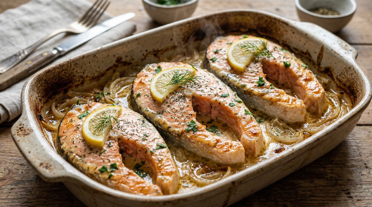 Что понадобится: горбуша — одна штука, примерно на килограмм-полтора (можно взять целую, можно разделать на стейки, я чаще делаю стейками), одна крупная луковица, сто пятьдесят граммов сметаны жирностью не ниже двадцати процентов, два зубчика чеснока, один небольшой лимон, соль, чёрный молотый перец, пара щепоток сушёного укропа или петрушки, столовая ложка растительного масла для смазывания формы.