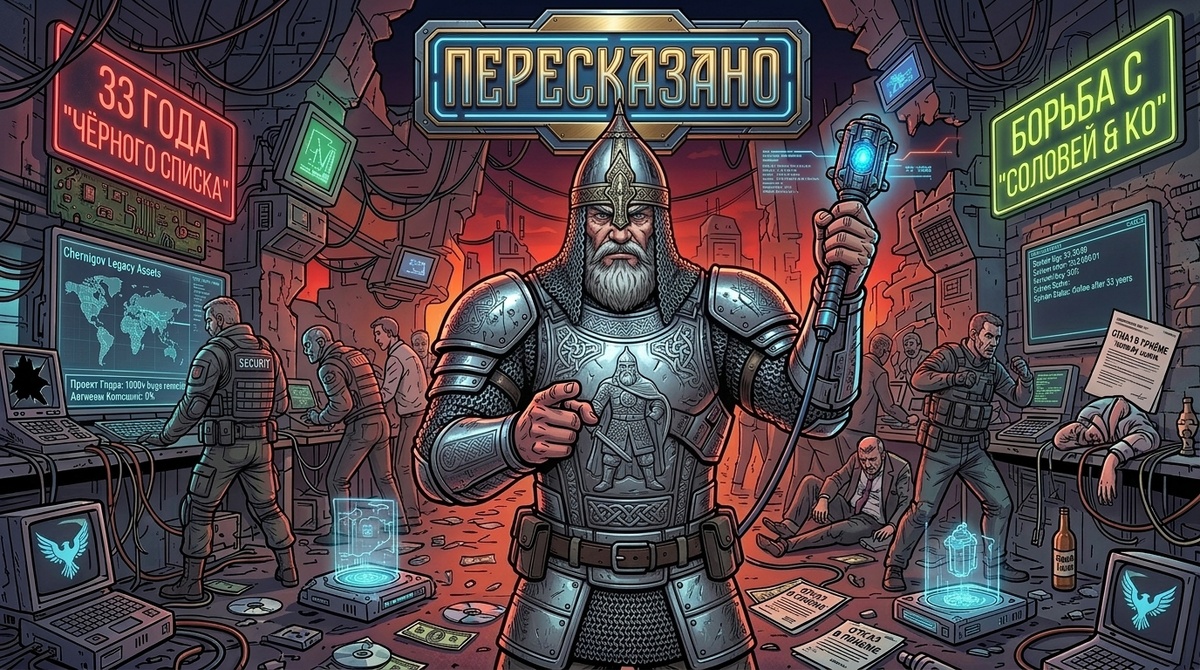 Вы думаете, Илья Муромец — это былинный богатырь? Мимо. Это история про айтишника-самородка, которого 33 года держали в «чёрном списке» кадровые службы, пока он не решил, что хватит сидеть на диване. Здесь есть всё: хайповая нейросеть «Соловей», токсичный медийщик, который визжит на всех переговорках, рейдерский захват черниговских легаси-активов и эпичная встреча с главным инфоцыганом Руси.
