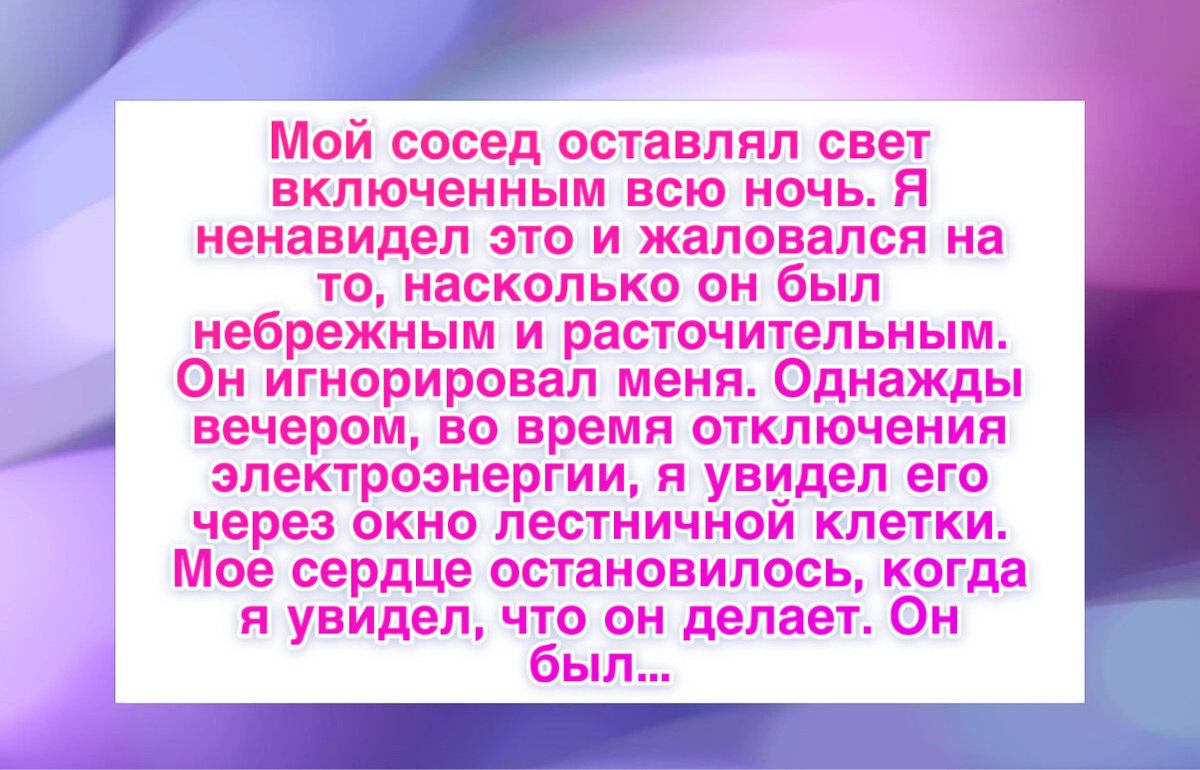 “Я раньше злился на соседа, потому что у него каждую ночь горел свет. Я думал, что он просто забывает его выключать. Однажды во время отключения электричества я увидел его через окно на лестнице. Он сидел с маленьким мальчиком и читал ему при фонарике. Оказалось, это его приемный сын, и темнота вызывала у него панические атаки из за прошлого. После этого я больше никогда не жаловался на свет.”
