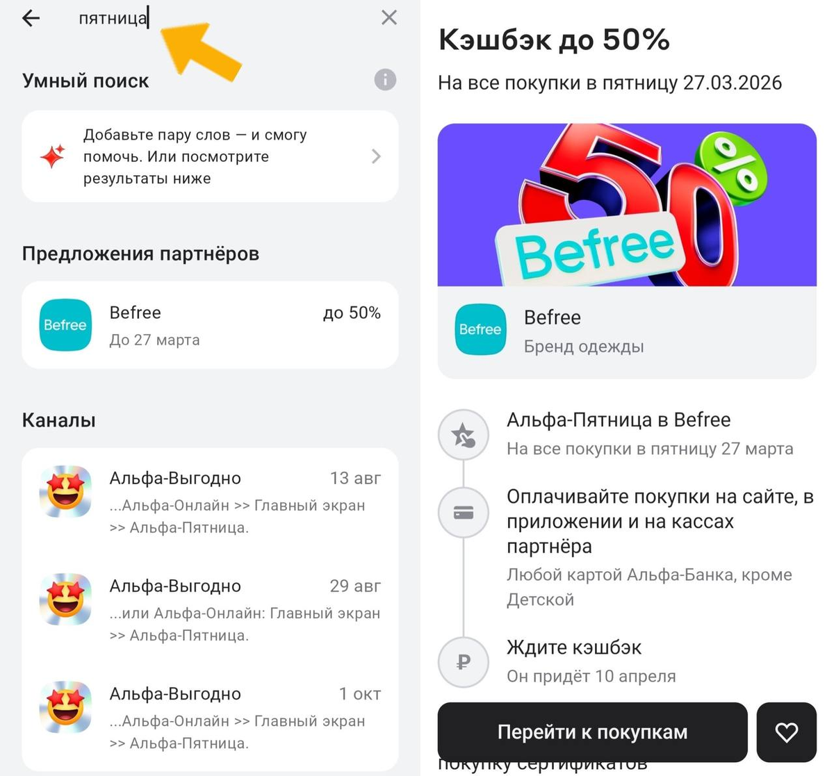 Еще одна акция появилась в приложении Альфа-Банка В поиске пишем - пятница Befree – 50%, макс 5000₽ за все покупки 27.03.26 в магазинах, на сайте или в приложении FAQ / Правила Кэшбэк не начисляется за покупку сертификатов и при применении промокодов на онлайн-заказы. Больше информации о банковских продуктах и способах заработка есть в телеграмм канале и VK. Всех благ 💗