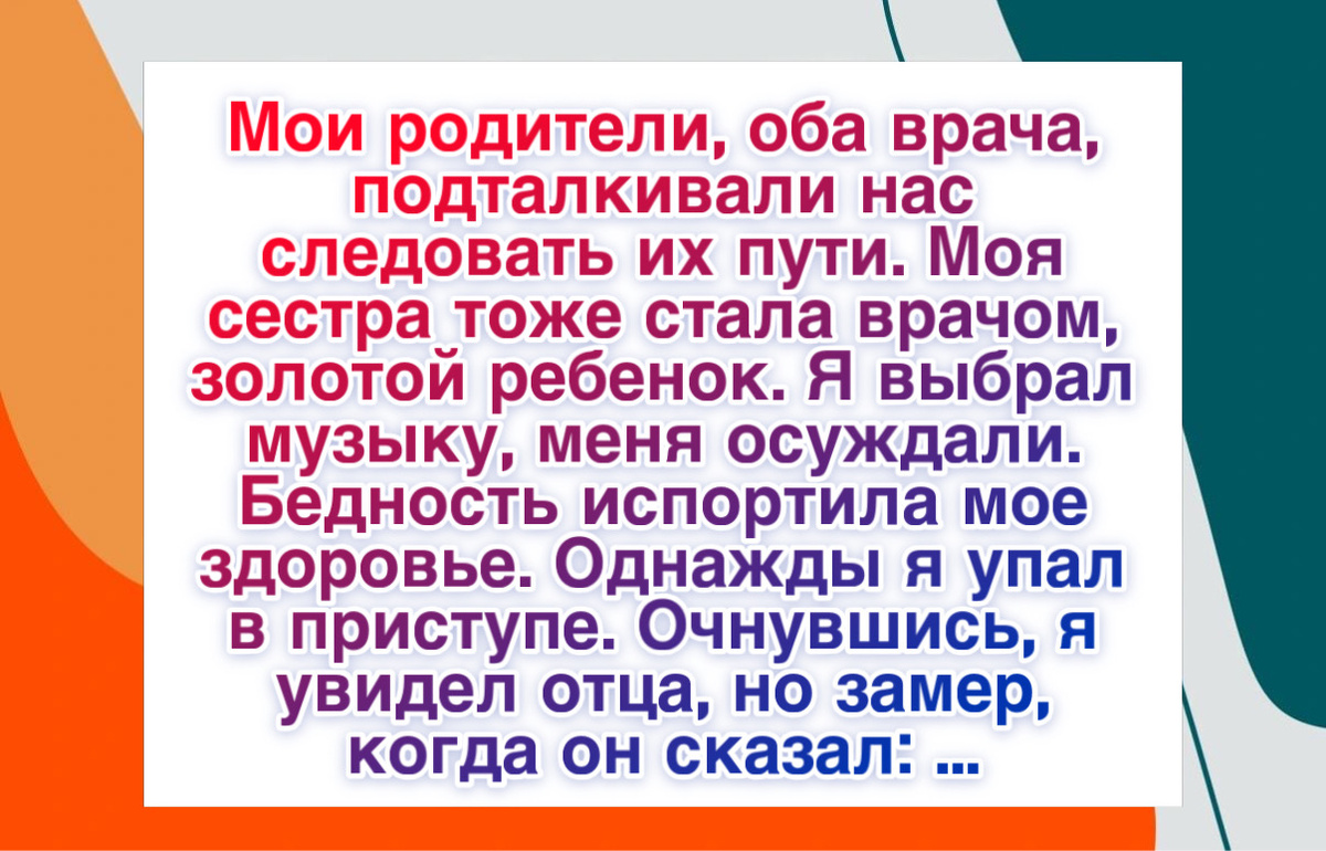 “Мои родители были врачами и хотели, чтобы мы пошли по их пути. Моя сестра пошла, она была любимицей. Я выбрал музыку, и меня лишили финансовой поддержки. Бедность сильно ударила по моему здоровью. Я потерял сознание, мне срочно нужна была помощь, а денег не было. Я очнулся и увидел отца в медицинской форме. Я замер, когда он сказал: Я тебе не банк и не запасной вариант. Потом он сделал паузу и сказал: Но я все равно твой отец. Мне не нравится, что ты выбрал, но я не могу позволить тебе умереть из-за этого.”
