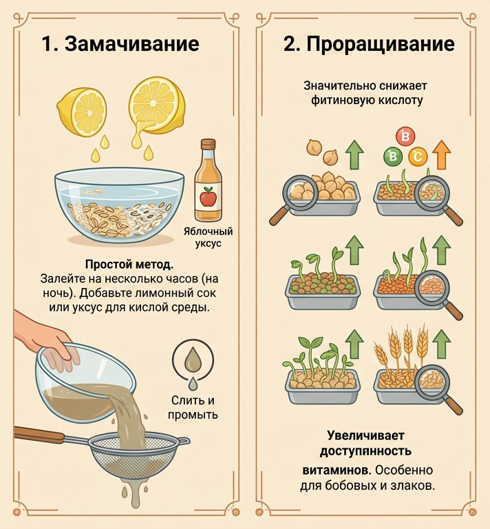Полностью исключать богатые фитиновой кислотой продукты не нужно - они являются важным источником питательных веществ. Вместо этого их нужно правильно готовить Это самый простой и доступный метод. Просто залейте крупы, бобовые или орехи водой на несколько часов (удобно делать это на ночь). Для большей эффективности в воду можно добавить немного лимонного сока или яблочного уксуса, создав кислую среду. После замачивания воду обязательно нужно слить, а продукты промыть. 2. Проращивание. Этот метод позволяет значительно снизить содержание фитиновой кислоты, особенно в бобовых (например, в нуте и чечевице) и злаках. Проращивание не только разрушает антинутриенты, но и увеличивает доступность витаминов. 3. Ферментация (сквашивание) Это самый эффективный способ. Молочнокислые бактерии, участвующие в процессе ферментации, вырабатывают фитазу — фермент, который расщепляет фитиновую кислоту. Классический пример — хлеб на закваске. Исследования показывают, что в цельнозерновом хлебе на закваске,