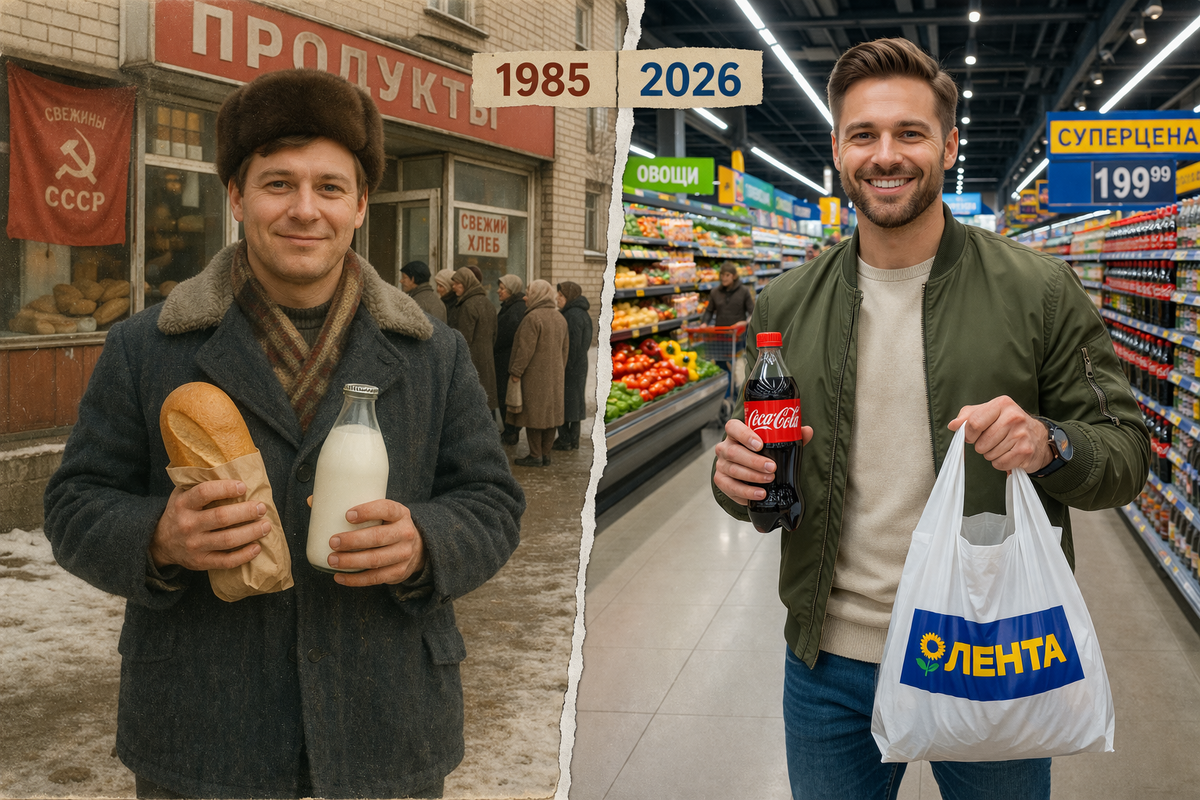 В 1985 году зарплата инженера — 180 рублей. Звучит как насмешка, правда? Но на эти деньги он оплачивал квартиру за 12 рублей, покупал хлеб по 20 копеек и мог откладывать на «Жигули». Сегодня инженер получает в среднем 60 000 рублей — и часто не может позволить себе даже половину того, что мог его советский коллега. Или всё-таки может? Вот тут начинается самое интересное. Потому что если разложить цены не в рублях, а в рабочих часах — картина получается совсем не такая однозначная, как кажется. Средняя зарплата в СССР в 1985 году — около 190 рублей. Давайте переведём в конкретные продукты. Килограмм говядины на рынке — 3–4 рубля. Литр молока — 28 копеек. Десяток яиц — 90 копеек. Сахар — 90 копеек за кило. Батон белого хлеба — 13 копеек. На зарплату можно было купить примерно 670 батонов хлеба. Или 50 килограммов мяса. Или залить полный бак бензина раз двадцать — литр АИ-93 стоил 40 копеек. Цифры красивые. Но есть нюанс, о котором часто забывают. Вот здесь начинается честное сравнение