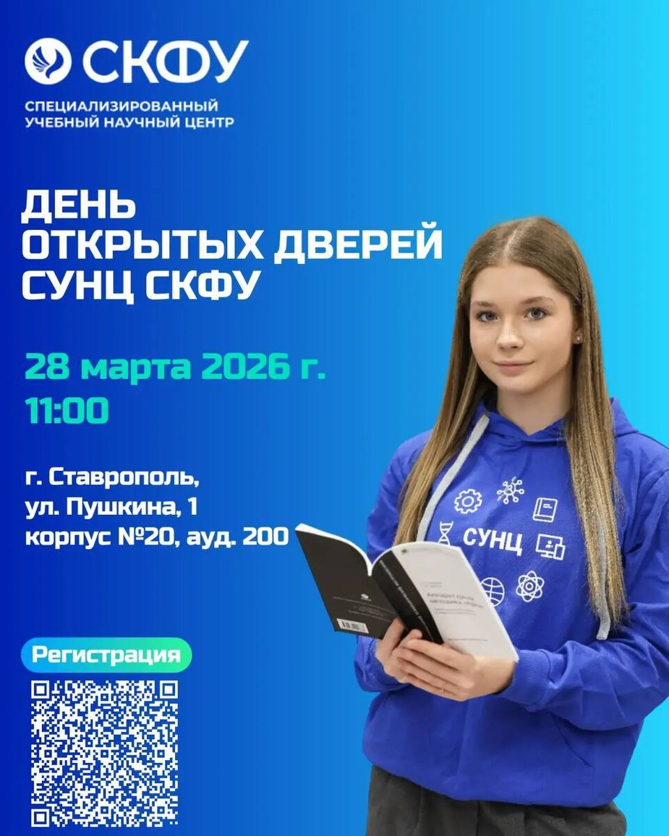 Специализированный учебный научный центр Северо-Кавказского федерального университета приглашает школьников и их родителей на День открытых дверей. Среди условий образования – бесплатное обучение, бесплатное общежитие для иногородних, шестиразовое питание, доступ в научные лаборатории, библиотеку, медицинский центр, спортивно-оздоровительный комплекс и бассейн 👩🏻🏫 СУНЦ СКФУ – единственная в макрорегионе профильная школа нового типа, открытая на базе университета. Здесь учащиеся не только осваивают школьную программу, но и занимаются научной и проектной деятельностью под руководством ученых СКФУ, готовятся к всероссийским и международным олимпиадам, участвуют в интеллектуальных турнирах и творческих конкурсах. Обучение проходит в специализированных классах и современных лабораториях университета. 📌 Мероприятие пройдет 28 марта 2026 года в 11:00 по адресу: г. Ставрополь, ул. Пушкина, 1, корпус №20, ауд. 200. Зарегистрироваться можно здесь. #СКФУ #новостиСКФУ #АбитуриентСКФУ 👻