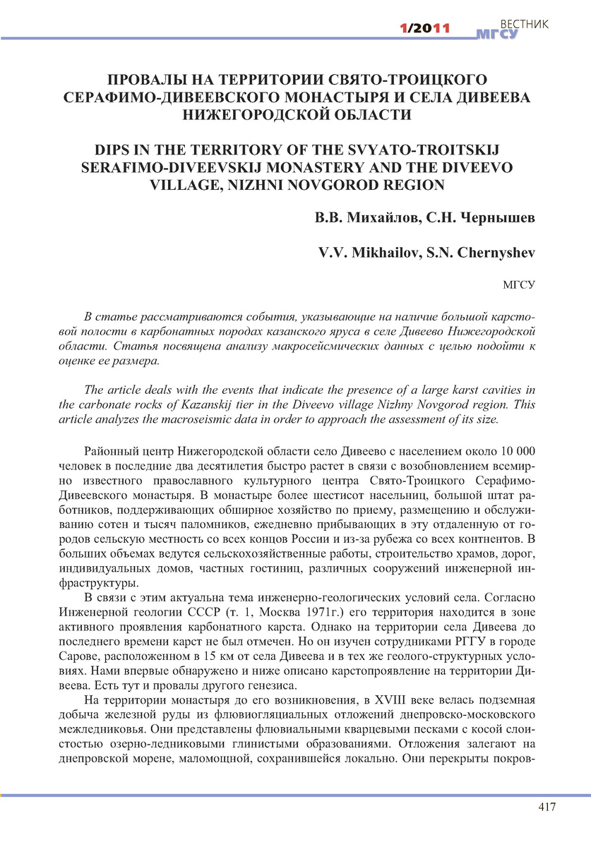 Специалисты Московского государственного строительного университета (МГСУ) провели исследование геологической обстановки в селе Дивеево Нижегородской области. Выводы, опубликованные в научном вестнике, указывают на наличие подземных пустот как естественного (карстового), так и техногенного происхождения на территории Свято-Троицкого Серафимо-Дивеевского монастыря и жилых кварталов.