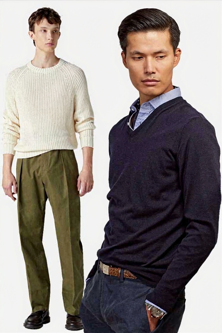 Ну то есть для кэжуал, например, прекрасно свитер с круглым вырезом с узорами с чинос или джинсами, для бизнес кэжуал или полуформального делового - однотонный V-образный поверх рубашки OCBD под пиджаком, а не вечерние или светские опенэйры еще добавить классические брюки, галстук и эффектные часы.