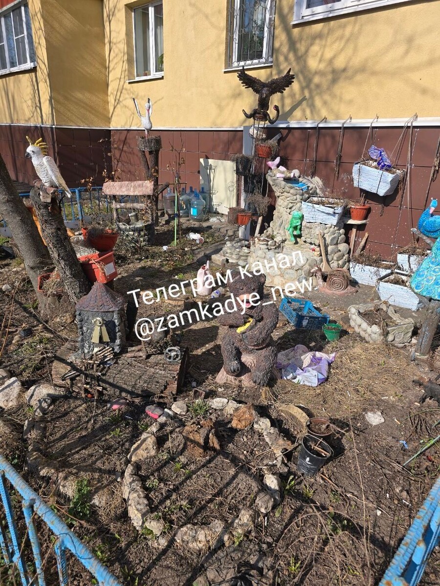 У жителей первого этажа под окнами целое произведение искусства. Все фигуры самодельные.