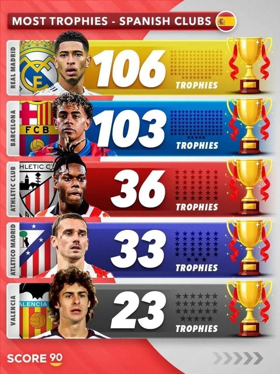 Лидеры испанского футбола по числу трофеев на сегодняшний день: