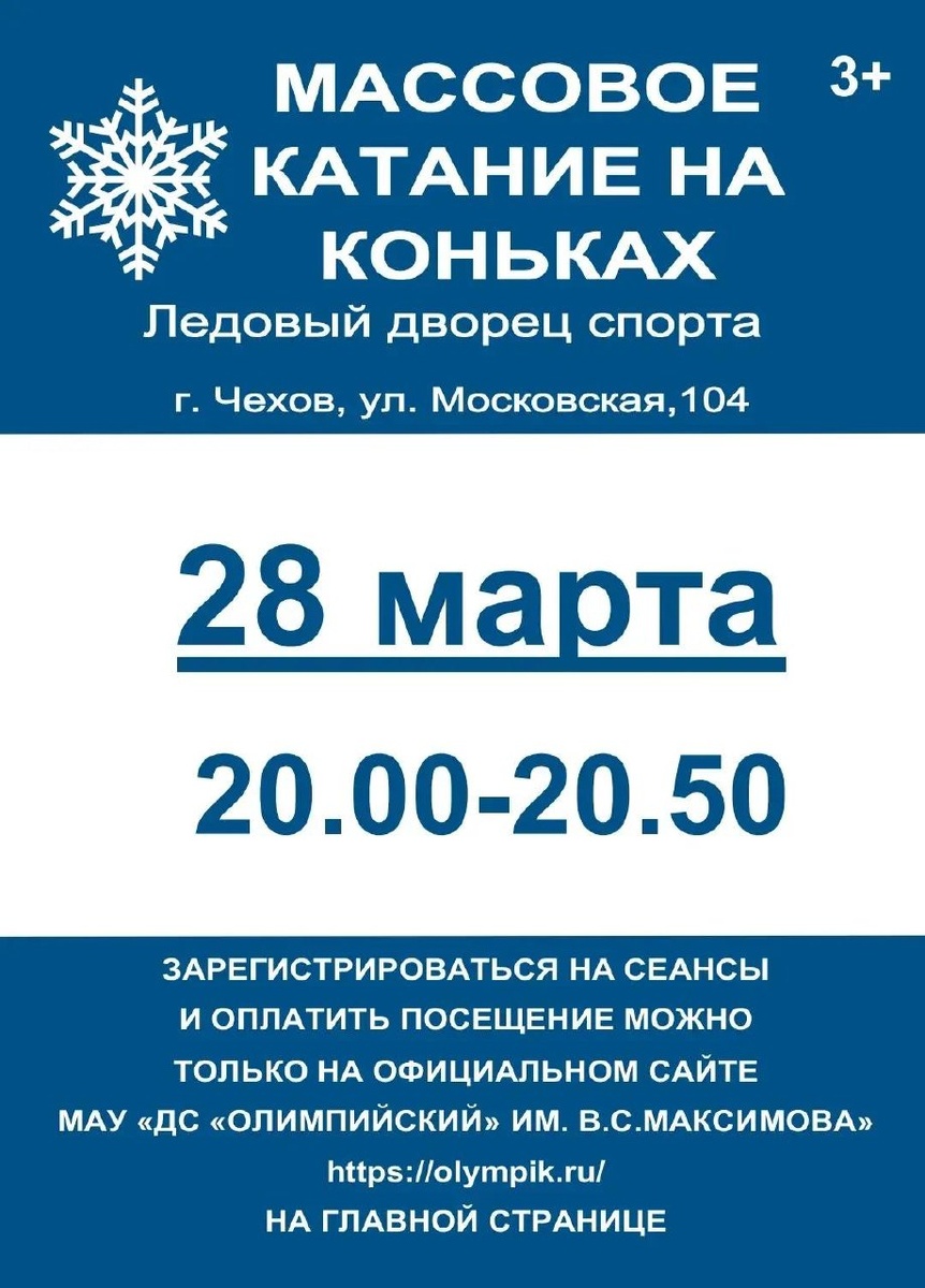 ✨ Массовое катание в Ледовом дворце 🧊 Сеанс с 20:00 до 20:50 🎵 К вашим услугам качественный лед, хорошая музыка, прокат и заточка коньков. ℹ️ Размеры коньков: с 27 по 46. 💵 Стоимость проката: детские 200 руб., взрослые 300 руб. 📆 28.03.2026 🕛 20:00 🏢 Ледовый дворец спорта «Витязь» 📍 г. Чехов, ул. Московская, д.104 🔗 Купить билет: https://clck.ru/3NsBk2 ⭐Поддержать канал голосом ✅ Мероприятия Чехов https://dzen.ru/id/66cc4b48e9ef144699238a51 https://vk.ru/chekhov_events http://dzen.ru/chekhov_events