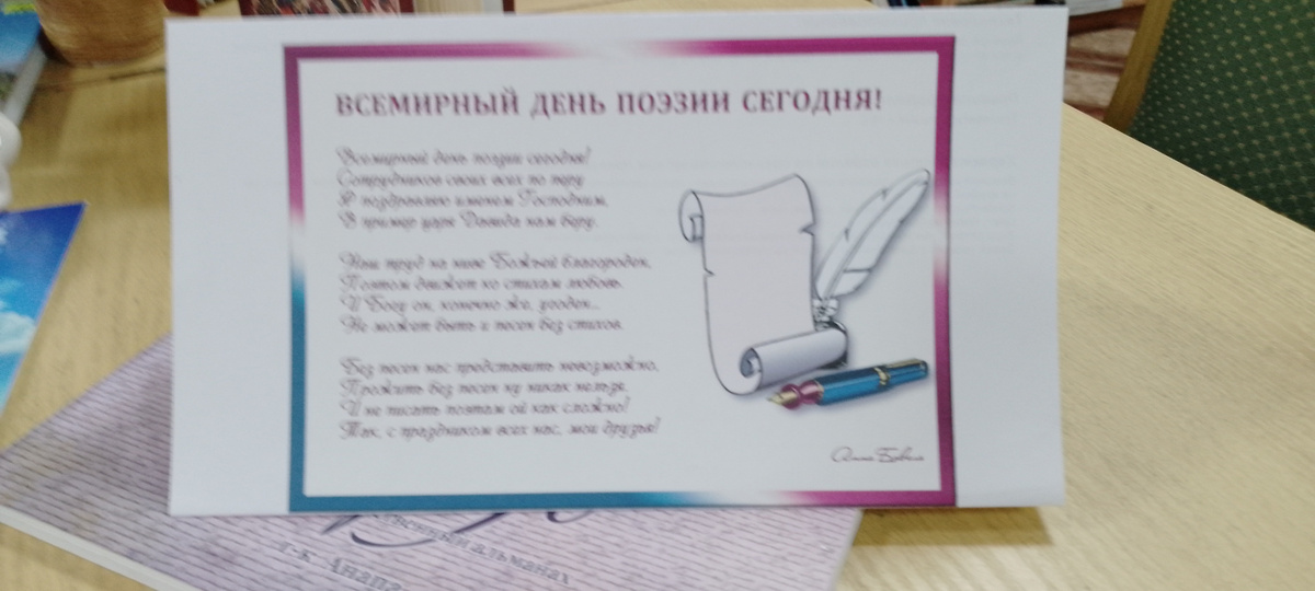 21 марта в Чеконской сельской библиотеке-филиале №25, прошел час поэтического настроения, литературное караоке «В краю великих вдохновений», приуроченному к Всемирному дню поэзии. И пусть поэзия прошла длиннейший путь, примерно в тридцать веков, у разных народов земли, русская поэзия не имеет себе равных. В очередной раз, библиотекарь рассказывая о поэзии русских гениев этого жанра вспомнила о Пушкине, Ахматовой, Пастернаке, Есенине, Лермонтове, Блоке, Тютчеве и т.д. В этот праздничный день гости мероприятия отвлеклись от обыденной суеты, от прозы жизни и окунулись в чарующий мир поэзии. Присутствующие не только были слушателями и зрителями, но и сами с удовольствием читали любимые строки известных поэтов. По всем правилам караоке, пользователи библиотеки выбирали карточки с названием стиха или строки из произведения или имя автора, затем выполняли задания которые были написаны на развороте карточки. Мероприятие прошло в творческой и дружеской обстановке, по итогом литературного кара