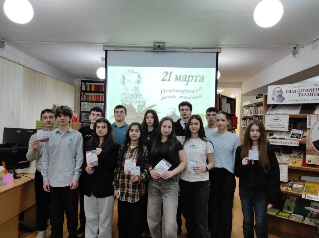 Доброй традицией в Межпоселенческой центральной библиотеке стал цикл мероприятий, приуроченный к Всемирному дню поэзии. Дата праздника — 21 марта — выбрана не случайно: март символизирует обновление природы, весеннее пробуждение и расцвет — именно то, с чем ассоциируется поэтическое искусство. Первыми, кто принял участие в литературном рандеву «Поэзия без границ», стали ученики 10-х классов Чалтырской средней школы №1 (на снимке). Ребята узнали о судьбах известных поэтов России и наших земляков, пропроверили свои знания в интеллектуальной викторине и получили памятные призы, которые, надеемся, вдохновят их на собственные литературные открытия. Мероприятие было проведено в рамках программы «Пушкинская карта».