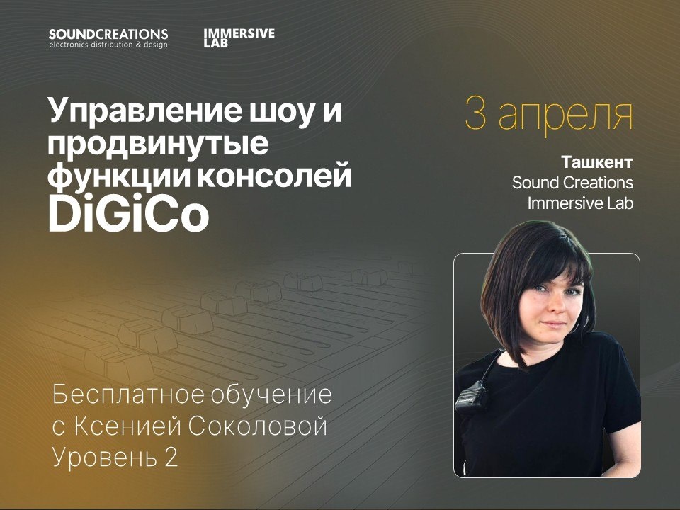 Тренинг DiGiCO Рады пригласить вас на второй уровень образовательной программы для звукорежиссёров — Festival Systems Workflow, посвящённой работе с цифровыми консолями DiGiCo. Уровень 2 — Workflow проведёт концертный звукорежиссёр Ксения Соколова. И особенно приятно, что этот тренинг станет одним из первых образовательных событий в только что открывшемся Sound Creations Immersive Lab — новом пространстве для обучения, практики, обмена опытом и развития профессиональных компетенций. Второй уровень посвящён углублённой работе с консолями DiGiCo и выстраиванию эффективного рабочего процесса в условиях реальных проектов. Вместе с Ксенией участники разберут построение сессии, работу со снепшотами, макросами, кастомными фейдер-банками и другими инструментами, которые позволяют выстроить быстрый, удобный и понятный workflow для управления шоу. Рекомендуем пройти Уровень 2: • специалистам с опытом работы с цифровыми микшерными консолями и понимание фестивального процесса, • участникам,