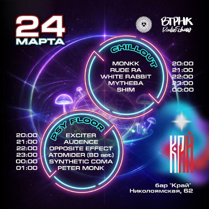 24 марта Подробно рассказываем, какие кайфы мы уже запланировали на грядущий вторник: Ближний зал: Geometric Paradox - это арт коммьюнити, точка сборки для музыкантов, диджеев, художников и архитекторов звука. Союз творцов, для которых искусство - это способ изменить реальность вокруг и внутри себя. Все музыкальные участники Geometric paradox являются коллекционерами музыки. Поэтому их выступления это мультижанровые путешествия: от драйвового psy trance до задорного jungle, от глубокого органик-хауса до медитативного чиллаута и эмбиента. Главная цель - не разделять, а объединять, создавая единое гармоничное поле чистого вайба. За плечами сообщества - годы путешествий и выступлений. Они участвуют в организации многих фестивалей, а так же создают сцены и арт-инсталляции в России и других странах. Визитная карточка их визуального стиля - это объединение сакральной геометрии, древних символов и орнаментов, световых эффектов и природных материалов. Это не просто декор, это мандала, зад