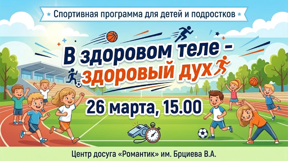 Приглашаем детей и подростков принять участие в увлекательной спортивно-игровой программе «В здоровом теле — здоровый дух». Мероприятие направлено на популяризацию активного образа жизни, развитие физических навыков и укрепление командного взаимодействия среди подрастающего поколения. Программа разработана с учетом возрастных особенностей участников, чтобы каждый смог проявить себя и получить заряд бодрости. Вход свободный. При себе рекомендуется иметь удобную одежду и сменную спортивную обувь. Мы верим, что физическая активность — это залог не только крепкого здоровья, но и отличного настроения. Ждем вас в нашем Центре досуга!