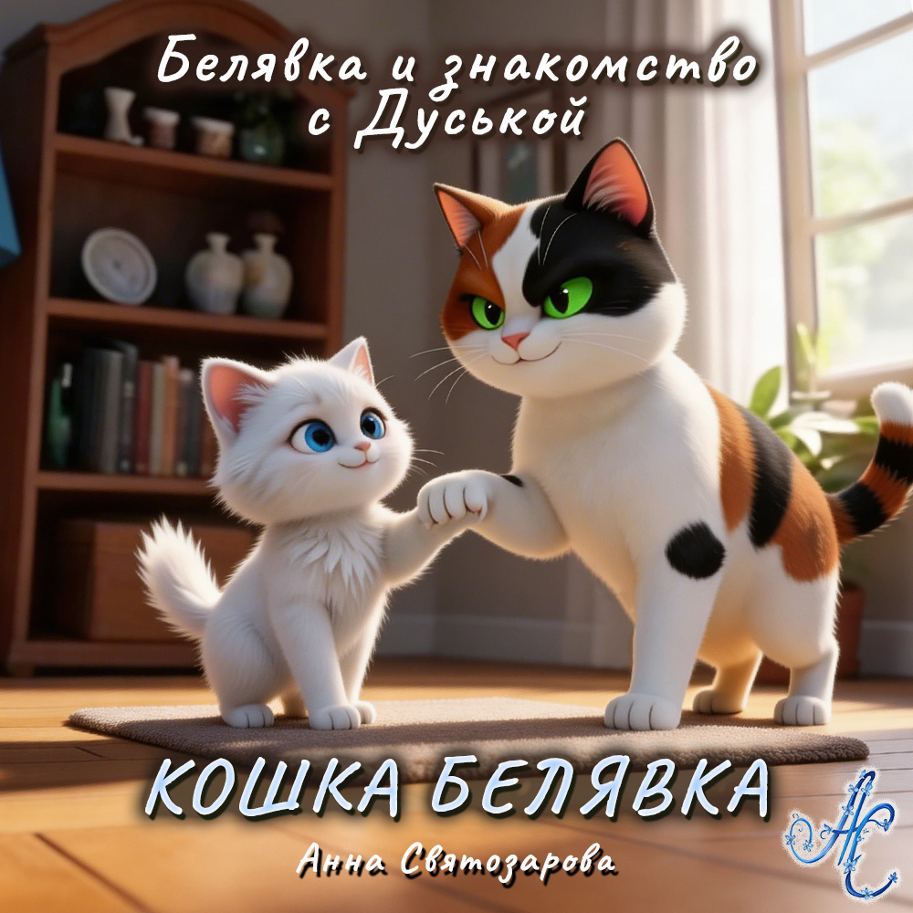 «Вот, решила я, — сказала тётя Наташа, — пора нашим кошечкам познакомиться. А то Дуська всё одна да одна, с Муськой не поиграешься, она старая и ворчливая. А Белявка вон какая энергичная растёт. Пусть играют вместе».