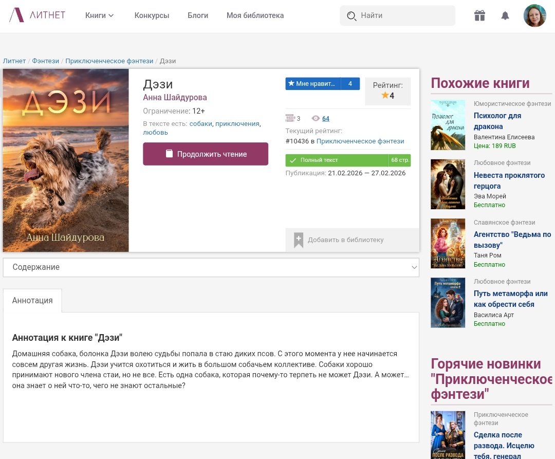 - «Попаданка в прошлое. Школа ведьм» в период с 22.02.26 по 14.03.26 (закончила выкладку на следующий день).