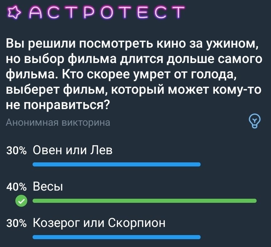 30% голосов получил вариант "Козерог или Скорпион" на вопрос: "Кто скорее умрет от голода, выберет фильм, который может кому-то не понравиться?" ℹ️ Козерог знает на полгода вперёд, что он будет смотреть. А Скорпион заставит смотреть, то что хотел ОН - заставит так искусно, что вы и не заметите 😉 Видимо, в вашей жизни встречались уникальные Скорпионы с Козерогами... с Луной в Весах 😅