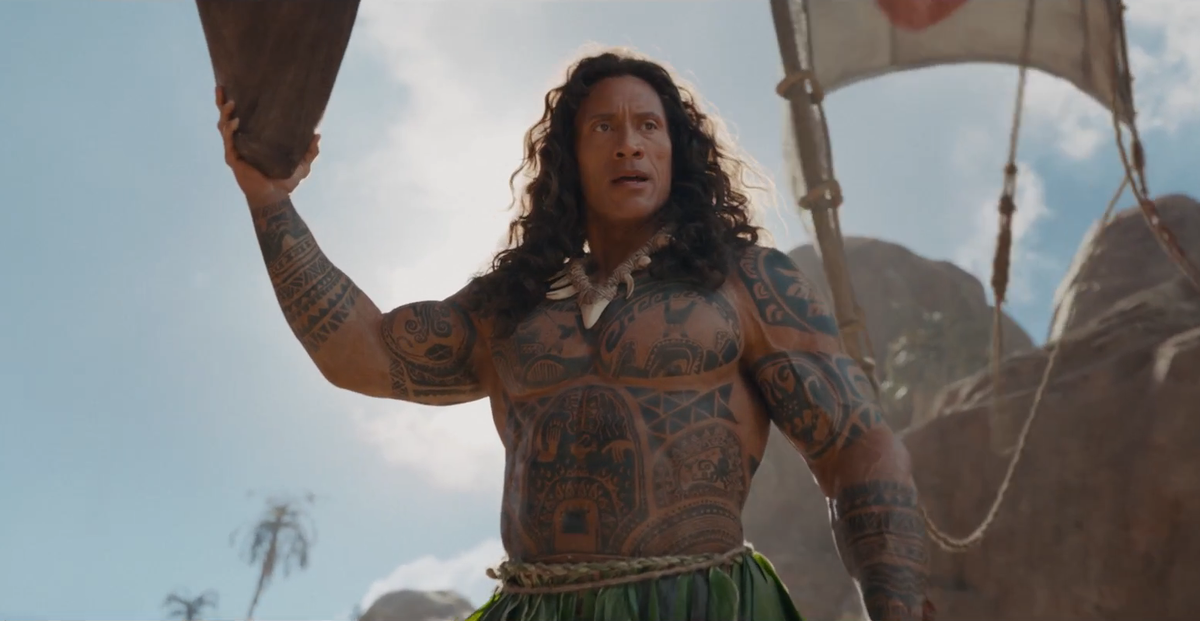И это при том, что в оригинале персонаж был весьма эмоциональным и экспрессивным. В ремейке той искры нет и в помине. В каждой сцене трейлера мы видим не "многоликого проказника", а только уставшего и забившего на всё Дуэйна Джонсона, который будто бы вообще не понимает, что снимается в "Моане", а не в очередном "Джуманджи". Серьёзно, разница только в дурацком парике и обновлённых татуировках. Мини-Мауи, кстати, буквально перенесли без каких-либо изменений.