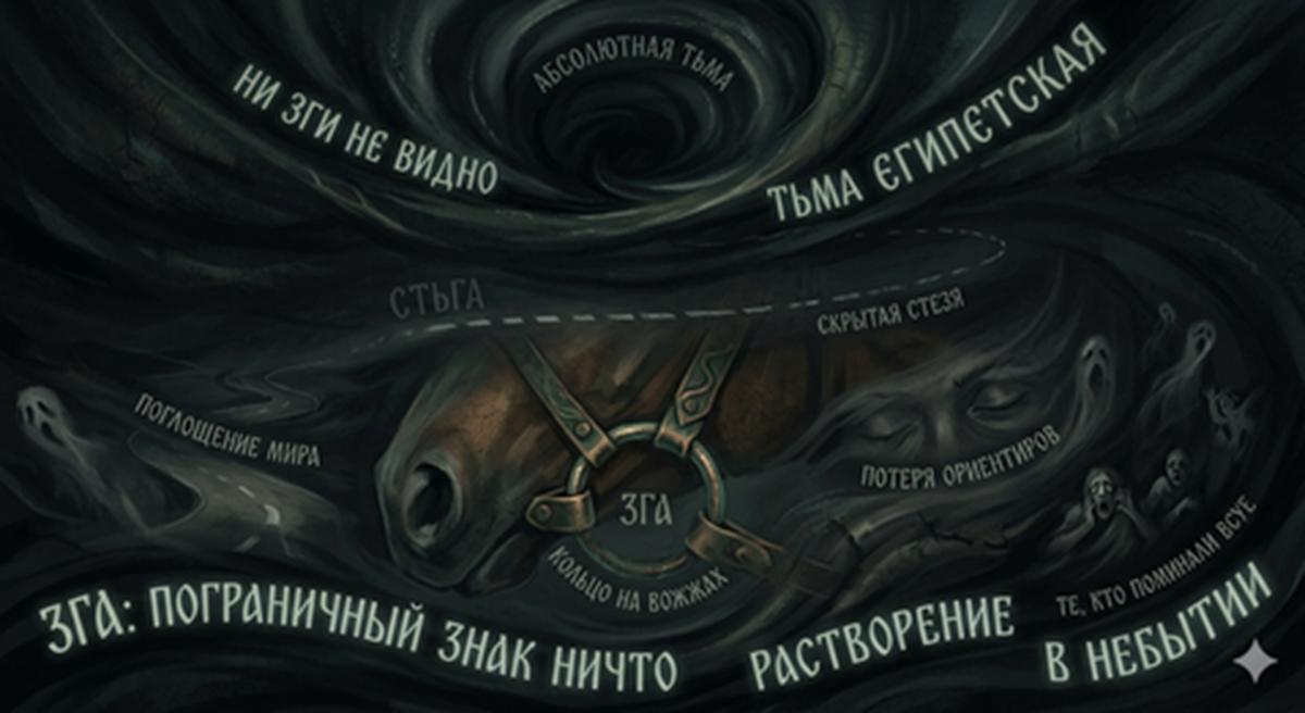 Но есть вторая версия, которая заставляет волосы на затылке шевелиться. В некоторых диалектах «згой» называли кольцо на лошадиной дуге, через которое продевали вожжи. Это кольцо находится прямо перед глазами ямщика. Если ночь настолько черная, что ты не видишь металлическое кольцо в полуметре от своего лица, это не просто отсутствие света. Это «тьма египетская», противоестественная пустота, в которой зрение перестает работать. В народных поверьях такая слепота наступала, когда человека «морочило» - когда само пространство искривлялось силами иного мира.