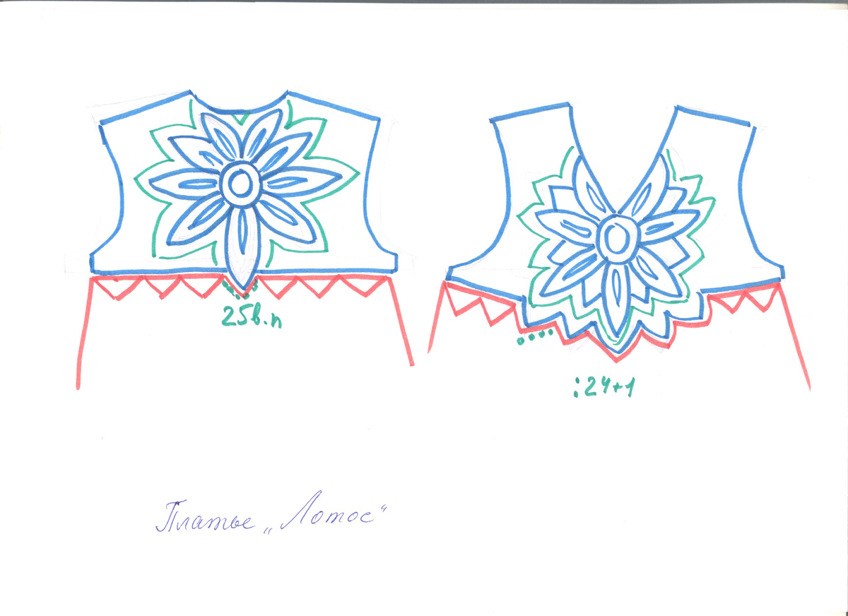 Для вязания платья "Лотос" вам потребуется 650-700 гр. ниток "Нежность", смесь хлопчатобумажных ниток и вискозы. Из них три отделочные: цвет "Б" - 50 гр., цвет "В" и "Г" по 100 гр.