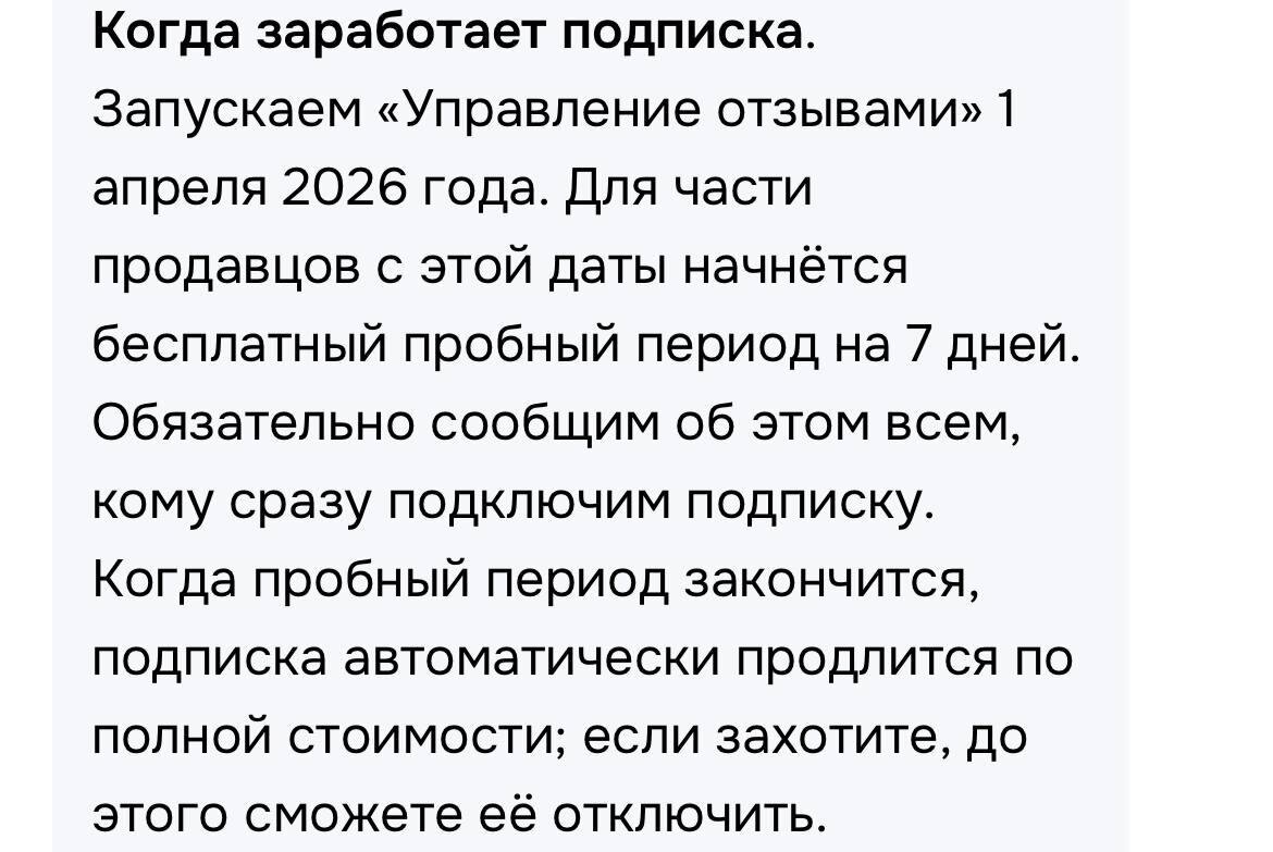 Ozon снова подключает платную подписку без явного согласия Будьте внимательны. С 1 апреля запускается «Управление отзывами». И часть селлеров получит её автоматически. Да, сначала будет 7 дней бесплатно. А дальше — подписка сама продлится уже за деньги. Формально всё «по правилам»: предупредим, дадим пробный период, можно отключить. По факту — классическая модель: подключили → не заметил → списание. Кого подключат — не раскрывается. Так что лучше просто проверить: не появился ли у вас новый «инструмент», который вы не подключали. Иначе через неделю узнаете о нём уже в отчёте. Если у вас плохо прогружаются файлы, все посты также доступны в MAX: https://max.ru/marketplace_biz