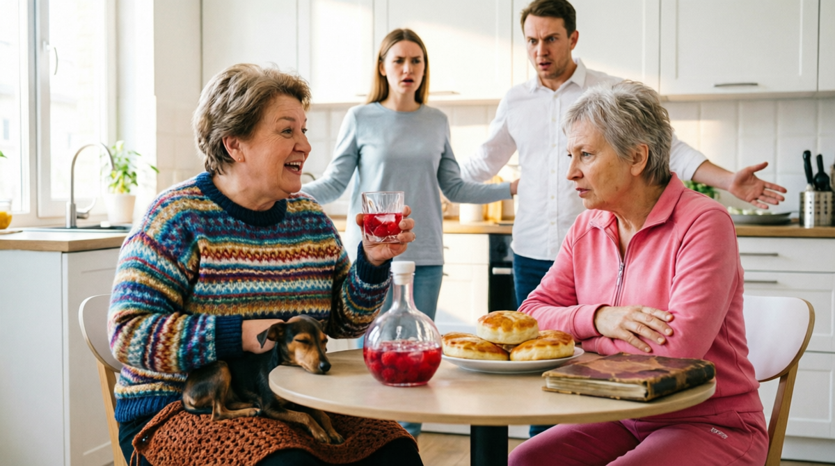 За столом сидели Галина Степановна и Анна Дмитриевна. Между ними стояла пузатая бутылка, тарелка с румяными пирожками и старый, потрепанный фотоальбом. Собачка Анны Дмитриевны мирно спала на коленях у Галины Степановны, укрытая вязаным платком.