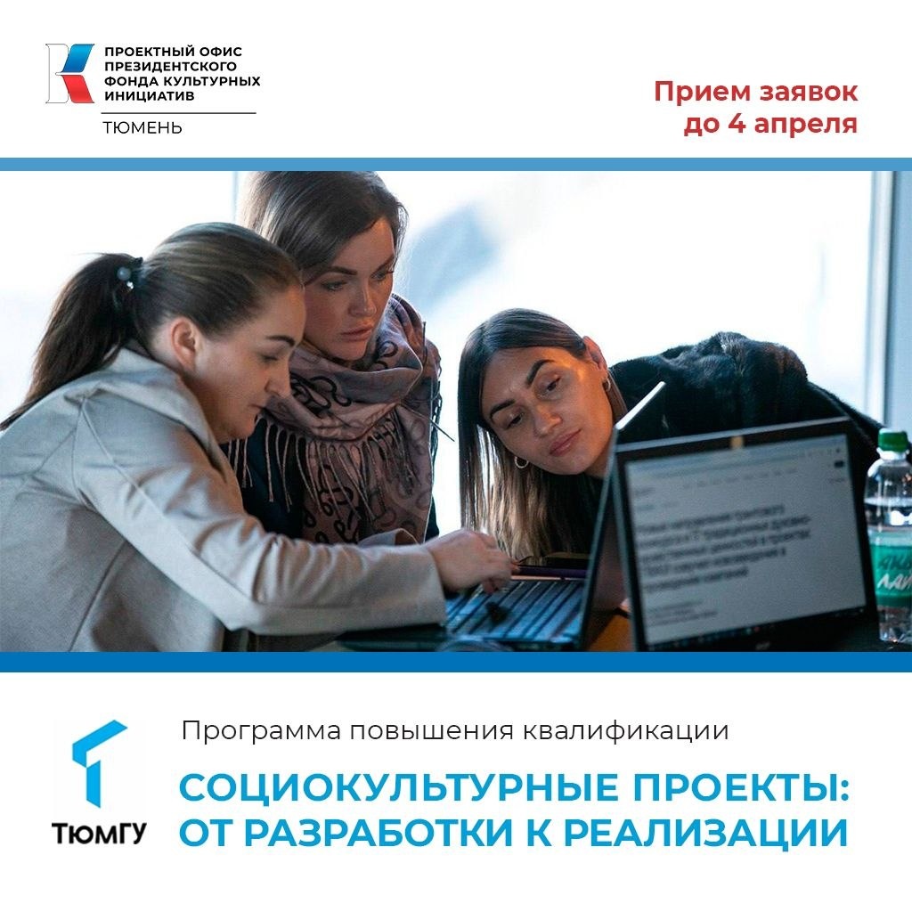 Участие бесплатное Проектный офис Президентского фонда культурных инициатив в Тюменской области и кафедра общей и экономической социологии ТюмГУ запускают программу повышения квалификации «Социокультурные проекты: от разработки к реализации», по итогам которой участники получат удостоверения установленного образца. Курс будет полезен сотрудникам учреждений культуры, НКО, индивидуальным предпринимателям и всем, кто планирует участвовать в грантовых конкурсах ПФКИ. Программа состоит из двух независимых модулей по 16 часов. Можно выбрать один модуль или пройти оба. ⭐МОДУЛЬ 1. «Социологические инструменты в разработке социокультурных инициатив» Формат: полностью онлайн (Яндекс.Телемост). Старт: 10 апреля. Занятия проходят в течение трёх недель и включают 6 сессий: вечерние (19:00–21:00) и дневные (14:00–16:00). Темы модуля: ‣ анализ ситуации и выявление проблемы; ‣ ценностное предложение и гипотезы о потребителе; ‣ обоснование общественной значимости, методы CustDev; ‣ специфика соц
