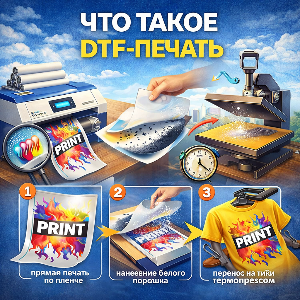 DTF (Direct To Film) — это печать изображения на специальную плёнку, которая затем переносится на ткань через термопресс. Работает почти как «наклейка», но профессионально и надёжно.