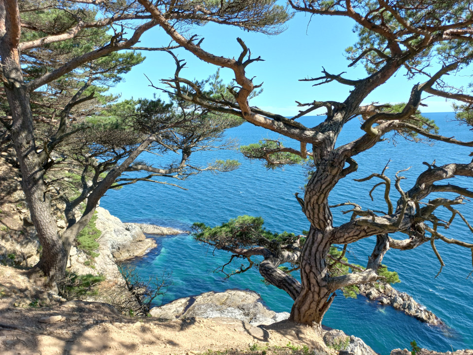 9. Могильные сосны — уникальный эндемик заповедника. В бухте Теляковского растут знаменитые могильные сосны — гибрид краснокнижной густоцветковой сосны с сосной обыкновенной. В России эти деревья растут только на юге Приморского края. Название связано с чжурчжэньской мифологией: сосны высаживали у подножия могильных холмов, так как считалось, что их боятся чудовища.