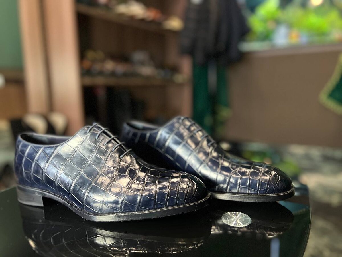 Тёмносиние цельнокройные оксфорды из брюшной части нильского крокодила в темно-синем цвете от Inbespoke