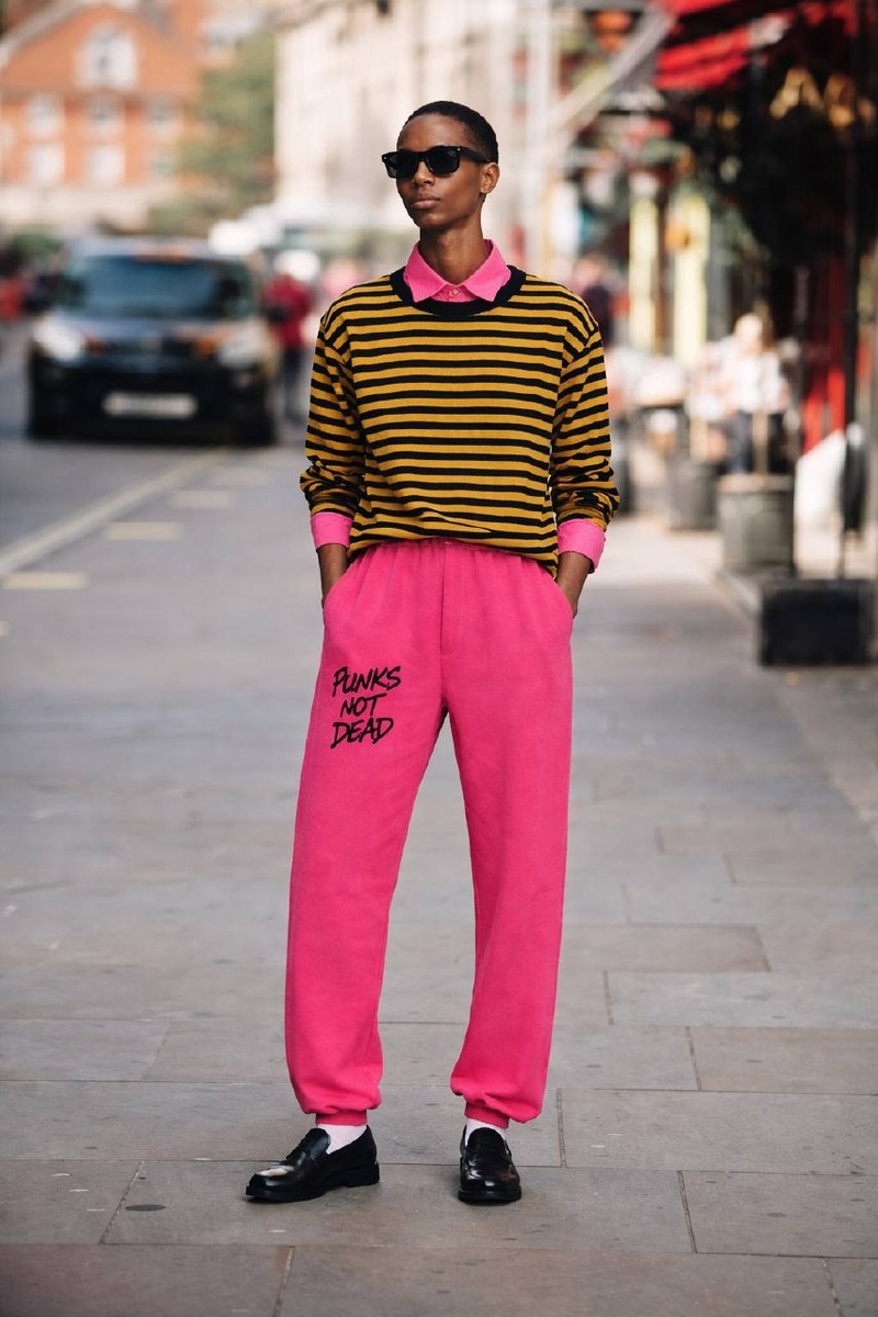 На фото брюки-джоггеры с надписью punks not dead (и как-будто к ним срочно нужны серьги из предыдущего поста)